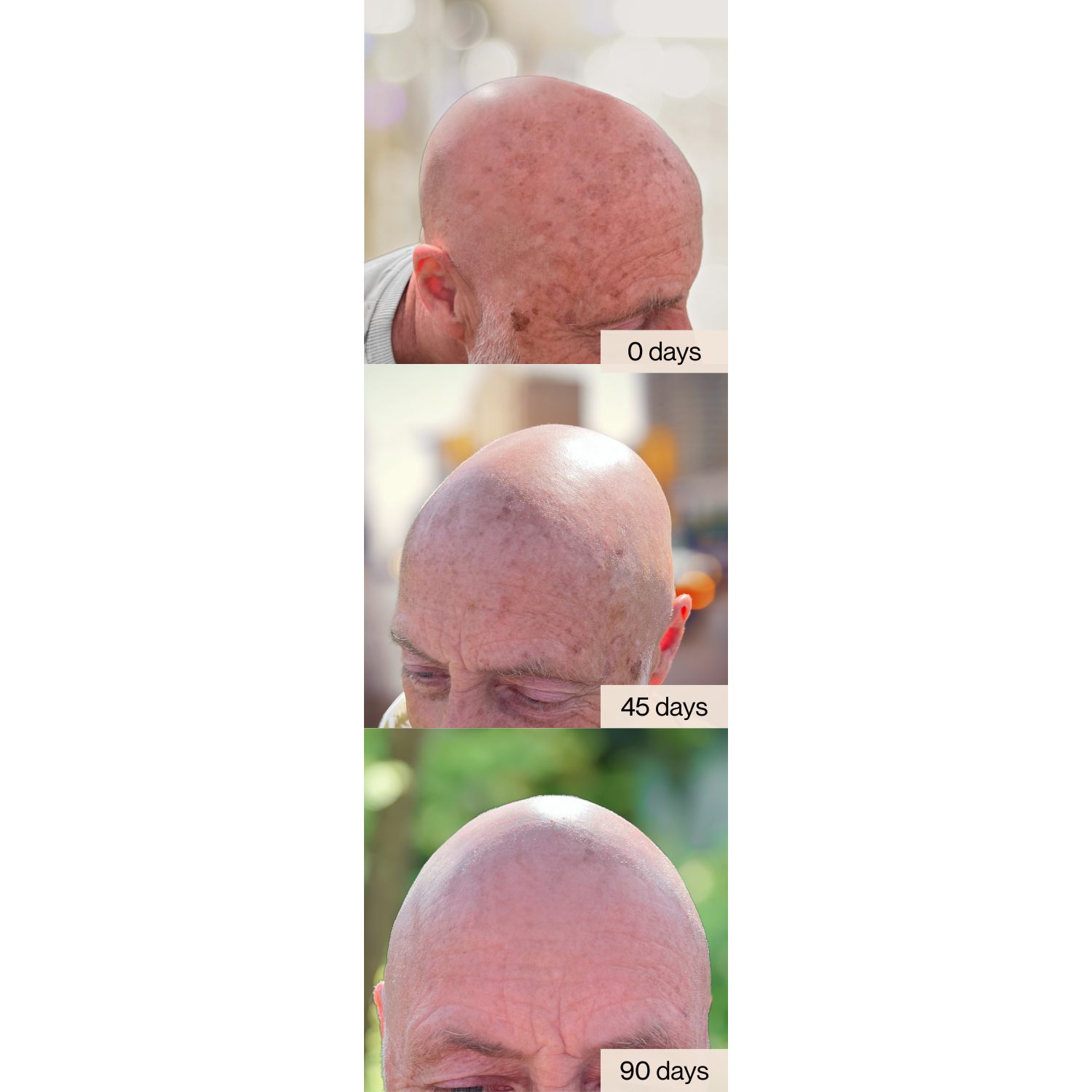 The bald serum performs several functions at once. You'll notice and feel an improved complexion and rejuvenated skin (more nourished and smoother skin) after just a few applications (approximately one week). Reducing pigmentation and age spots, however, requires some patience. Many clients experience initial success after about 6-8 weeks. Visible results should definitely appear after about 12-13 weeks.